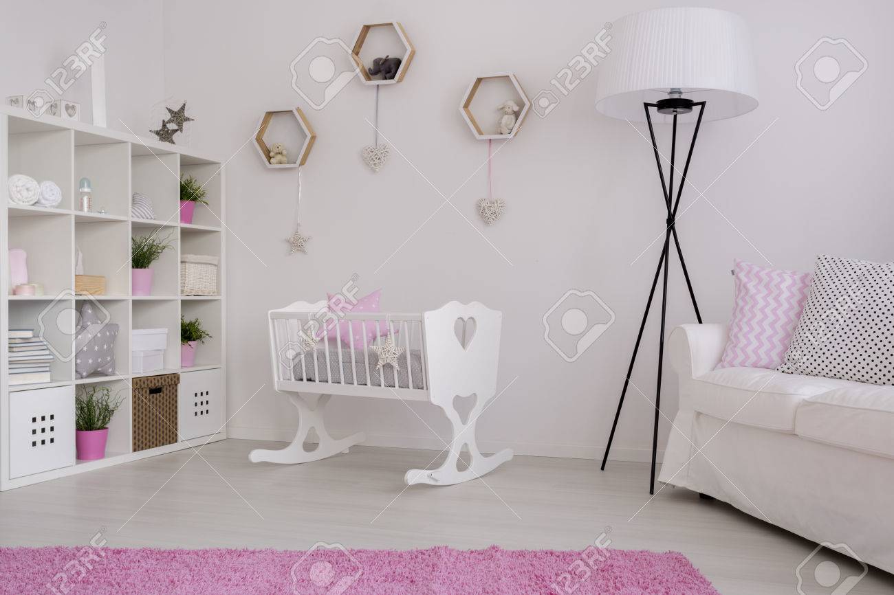 Esquina De La Habitacion De Un Bebe Con El Sofa Blanco Cuna Y Una Alfombra De Color Rosa Suave Y Esponjosa Fotos Retratos Imagenes Y Fotografia De Archivo Libres De Derecho Image
